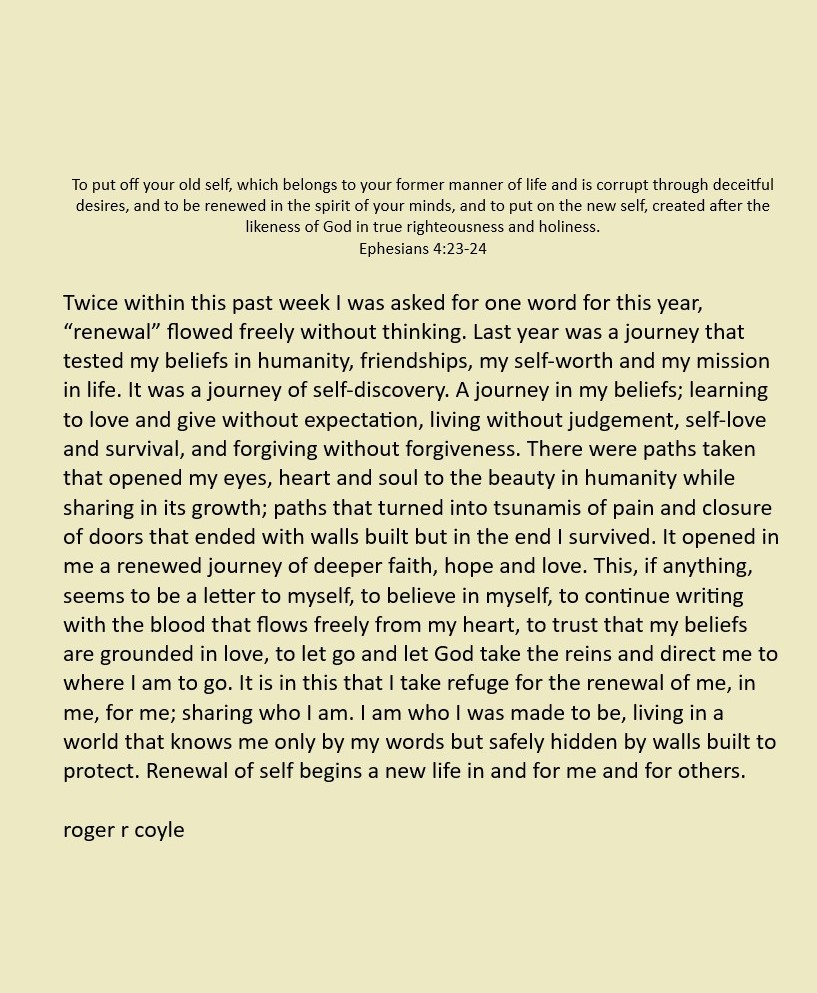 Some call me son, brother, godfather, cousin, uncle, writer, author, veteran, and friend. That may be true, but mostly I am me - a unique human being who has run the race of life through many different forests, down many roaring rivers and along some tangled paths. All in all it has been a good journey of growth and expansion of self. I am a lover of family, animals, food, laughs, poetry, books, compassionate people and chasing the light. My first journey into writing is Quiet Thoughts: Written Reflections. It is a book of poems and reflections - a small flicker of light into my life journey. I currently reside in Emmaus, PA and enjoy all that the Lehigh Valley has to offer. View all posts by rogerrcoyle