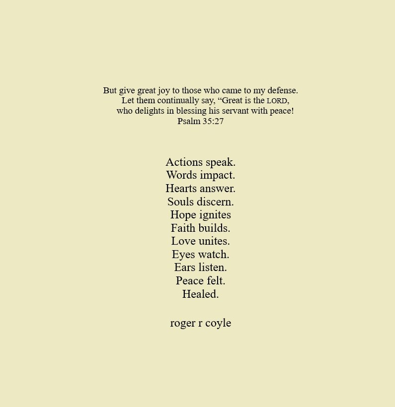Some call me son, brother, godfather, cousin, uncle, writer, author, veteran, and friend. That may be true, but mostly I am me - a unique human being who has run the race of life through many different forests, down many roaring rivers and along some tangled paths. All in all it has been a good journey of growth and expansion of self. I am a lover of family, animals, food, laughs, poetry, books, compassionate people and chasing the light. My first journey into writing is Quiet Thoughts: Written Reflections. It is a book of poems and reflections - a small flicker of light into my life journey. I currently reside in Emmaus, PA and enjoy all that the Lehigh Valley has to offer. View all posts by rogerrcoyle