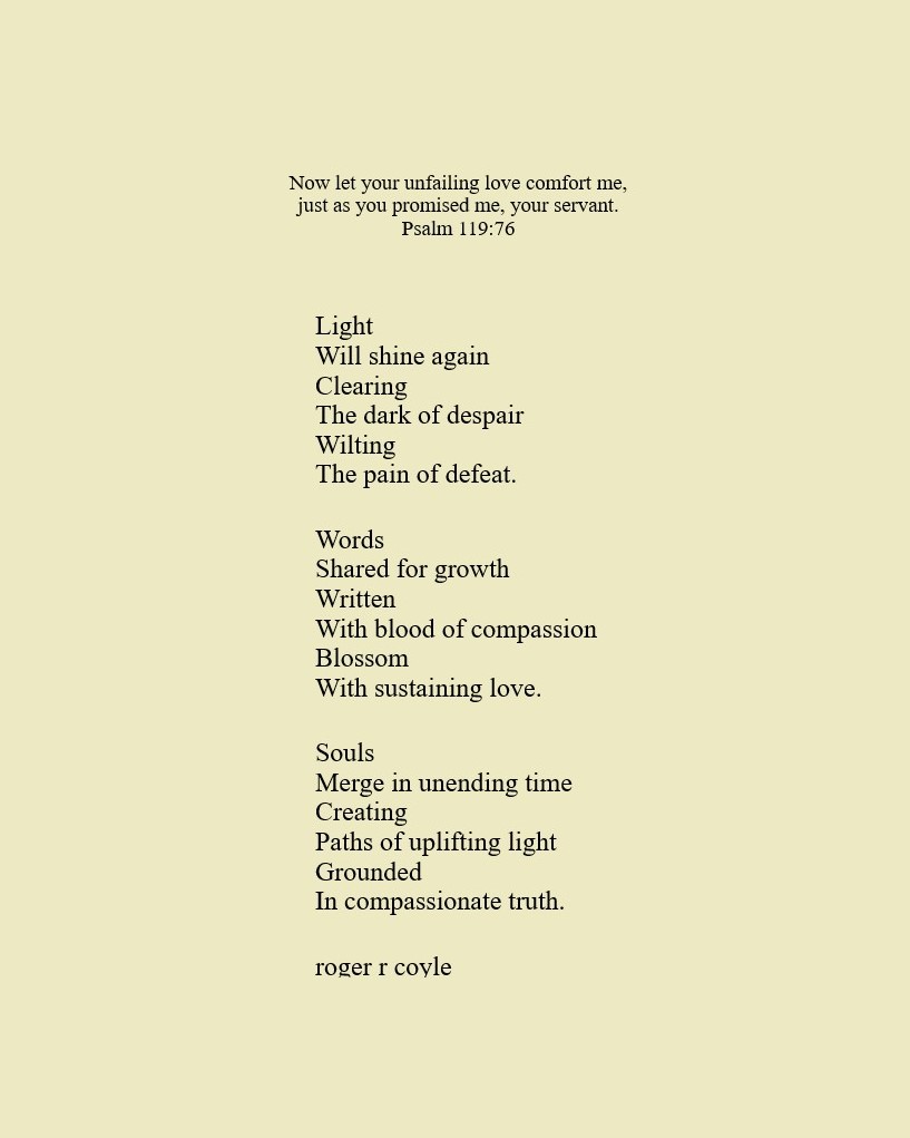 Some call me son, brother, godfather, cousin, uncle, writer, author, veteran, and friend. That may be true, but mostly I am me - a unique human being who has run the race of life through many different forests, down many roaring rivers and along some tangled paths. All in all it has been a good journey of growth and expansion of self. I am a lover of family, animals, food, laughs, poetry, books, compassionate people and chasing the light. My first journey into writing is Quiet Thoughts: Written Reflections. It is a book of poems and reflections - a small flicker of light into my life journey. I currently reside in Emmaus, PA and enjoy all that the Lehigh Valley has to offer. View all posts by rogerrcoyle