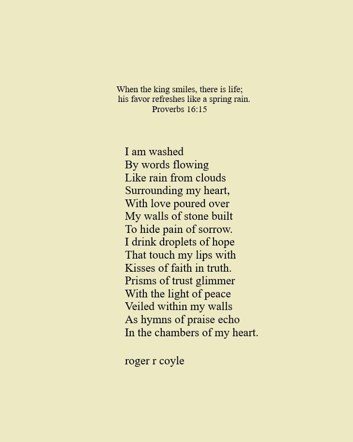 Some call me son, brother, godfather, cousin, uncle, writer, author, veteran, and friend. That may be true, but mostly I am me - a unique human being who has run the race of life through many different forests, down many roaring rivers and along some tangled paths. All in all it has been a good journey of growth and expansion of self. I am a lover of family, animals, food, laughs, poetry, books, compassionate people and chasing the light. My first journey into writing is Quiet Thoughts: Written Reflections. It is a book of poems and reflections - a small flicker of light into my life journey. I currently reside in Emmaus, PA and enjoy all that the Lehigh Valley has to offer. View all posts by rogerrcoyle