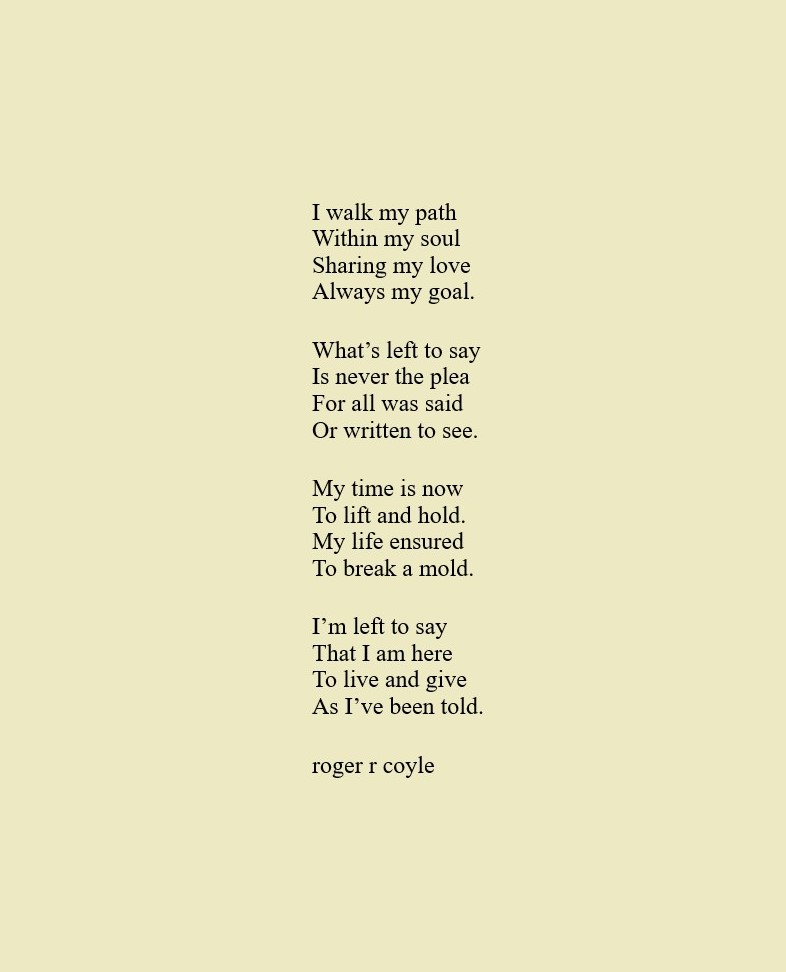 Some call me son, brother, godfather, cousin, uncle, writer, author, veteran, and friend. That may be true, but mostly I am me - a unique human being who has run the race of life through many different forests, down many roaring rivers and along some tangled paths. All in all it has been a good journey of growth and expansion of self. I am a lover of family, animals, food, laughs, poetry, books, compassionate people and chasing the light. My first journey into writing is Quiet Thoughts: Written Reflections. It is a book of poems and reflections - a small flicker of light into my life journey. I currently reside in Emmaus, PA and enjoy all that the Lehigh Valley has to offer. View all posts by rogerrcoyle