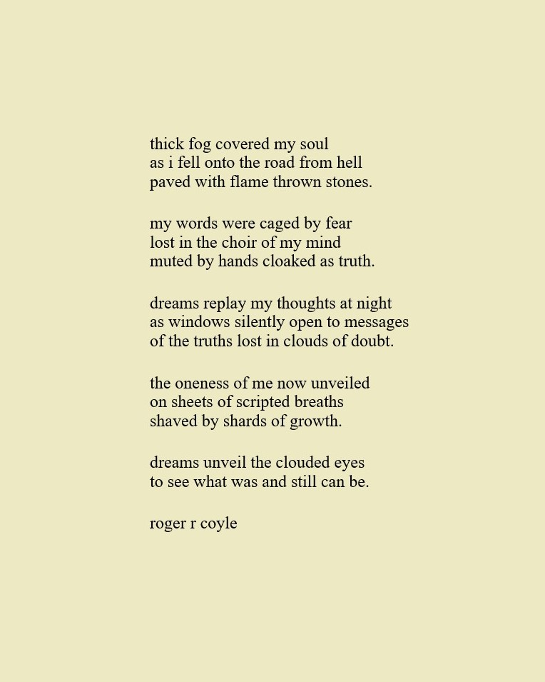 Some call me son, brother, godfather, cousin, uncle, writer, author, veteran, and friend. That may be true, but mostly I am me - a unique human being who has run the race of life through many different forests, down many roaring rivers and along some tangled paths. All in all it has been a good journey of growth and expansion of self. I am a lover of family, animals, food, laughs, poetry, books, compassionate people and chasing the light. My first journey into writing is Quiet Thoughts: Written Reflections. It is a book of poems and reflections - a small flicker of light into my life journey. I currently reside in Emmaus, PA and enjoy all that the Lehigh Valley has to offer. View all posts by rogerrcoyle