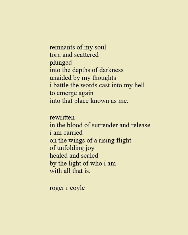 Some call me son, brother, godfather, cousin, uncle, writer, author, veteran, and friend. That may be true, but mostly I am me - a unique human being who has run the race of life through many different forests, down many roaring rivers and along some tangled paths. All in all it has been a good journey of growth and expansion of self. I am a lover of family, animals, food, laughs, poetry, books, compassionate people and chasing the light. My first journey into writing is Quiet Thoughts: Written Reflections. It is a book of poems and reflections - a small flicker of light into my life journey. I currently reside in Emmaus, PA and enjoy all that the Lehigh Valley has to offer. View all posts by rogerrcoyle