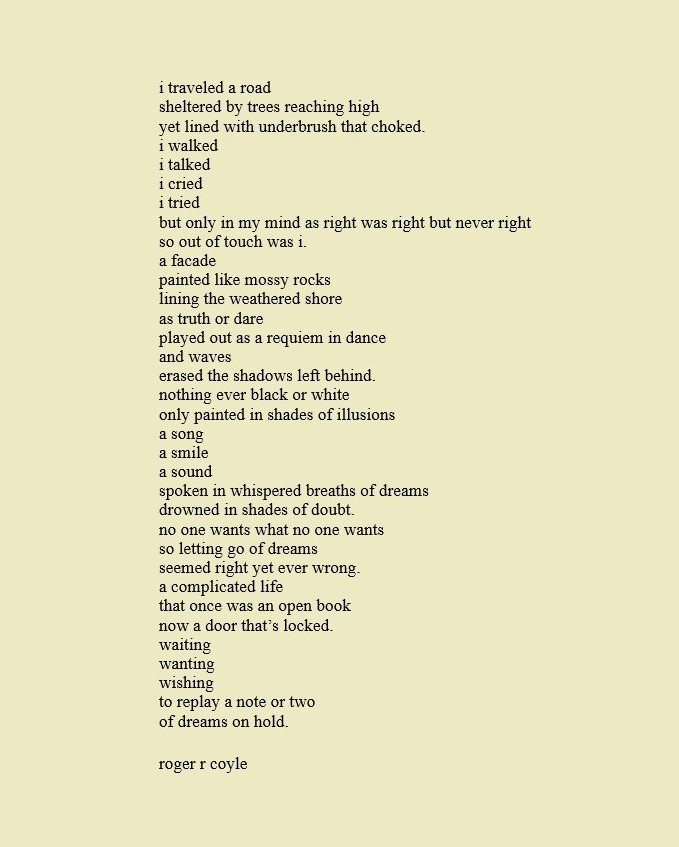 Some call me son, brother, godfather, cousin, uncle, writer, author, veteran, and friend. That may be true, but mostly I am me - a unique human being who has run the race of life through many different forests, down many roaring rivers and along some tangled paths. All in all it has been a good journey of growth and expansion of self. I am a lover of family, animals, food, laughs, poetry, books, compassionate people and chasing the light. My first journey into writing is Quiet Thoughts: Written Reflections. It is a book of poems and reflections - a small flicker of light into my life journey. I currently reside in Emmaus, PA and enjoy all that the Lehigh Valley has to offer. View all posts by rogerrcoyle