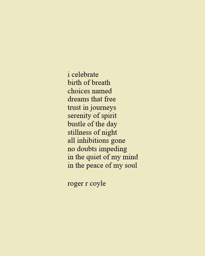 Some call me son, brother, godfather, cousin, uncle, writer, author, veteran, and friend. That may be true, but mostly I am me - a unique human being who has run the race of life through many different forests, down many roaring rivers and along some tangled paths. All in all it has been a good journey of growth and expansion of self. I am a lover of family, animals, food, laughs, poetry, books, compassionate people and chasing the light. My first journey into writing is Quiet Thoughts: Written Reflections. It is a book of poems and reflections - a small flicker of light into my life journey. I currently reside in Emmaus, PA and enjoy all that the Lehigh Valley has to offer. View all posts by rogerrcoyle
