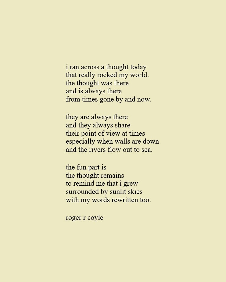Some call me son, brother, godfather, cousin, uncle, writer, author, veteran, and friend. That may be true, but mostly I am me - a unique human being who has run the race of life through many different forests, down many roaring rivers and along some tangled paths. All in all it has been a good journey of growth and expansion of self. I am a lover of family, animals, food, laughs, poetry, books, compassionate people and chasing the light. My first journey into writing is Quiet Thoughts: Written Reflections. It is a book of poems and reflections - a small flicker of light into my life journey. I currently reside in Emmaus, PA and enjoy all that the Lehigh Valley has to offer. View all posts by rogerrcoyle