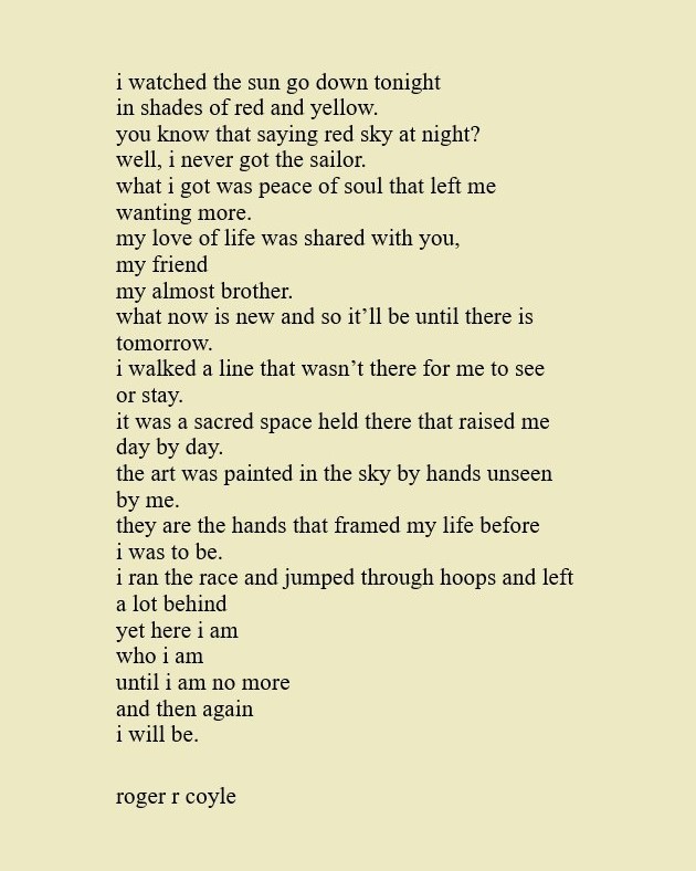 Some call me son, brother, godfather, cousin, uncle, writer, author, veteran, and friend. That may be true, but mostly I am me - a unique human being who has run the race of life through many different forests, down many roaring rivers and along some tangled paths. All in all it has been a good journey of growth and expansion of self. I am a lover of family, animals, food, laughs, poetry, books, compassionate people and chasing the light. My first journey into writing is Quiet Thoughts: Written Reflections. It is a book of poems and reflections - a small flicker of light into my life journey. I currently reside in Emmaus, PA and enjoy all that the Lehigh Valley has to offer. View all posts by rogerrcoyle
