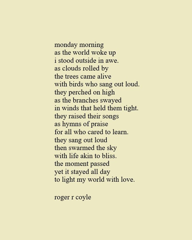 Some call me son, brother, godfather, cousin, uncle, writer, author, veteran, and friend. That may be true, but mostly I am me - a unique human being who has run the race of life through many different forests, down many roaring rivers and along some tangled paths. All in all it has been a good journey of growth and expansion of self. I am a lover of family, animals, food, laughs, poetry, books, compassionate people and chasing the light. My first journey into writing is Quiet Thoughts: Written Reflections. It is a book of poems and reflections - a small flicker of light into my life journey. I currently reside in Emmaus, PA and enjoy all that the Lehigh Valley has to offer. View all posts by rogerrcoyle