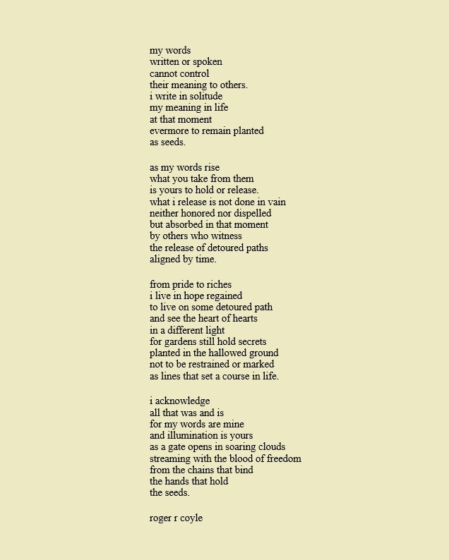 Some call me son, brother, godfather, cousin, uncle, writer, author, veteran, and friend. That may be true, but mostly I am me - a unique human being who has run the race of life through many different forests, down many roaring rivers and along some tangled paths. All in all it has been a good journey of growth and expansion of self. I am a lover of family, animals, food, laughs, poetry, books, compassionate people and chasing the light. My first journey into writing is Quiet Thoughts: Written Reflections. It is a book of poems and reflections - a small flicker of light into my life journey. I currently reside in Emmaus, PA and enjoy all that the Lehigh Valley has to offer. View all posts by rogerrcoyle