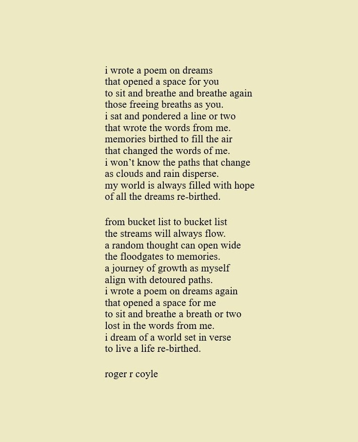 Some call me son, brother, godfather, cousin, uncle, writer, author, veteran, and friend. That may be true, but mostly I am me - a unique human being who has run the race of life through many different forests, down many roaring rivers and along some tangled paths. All in all it has been a good journey of growth and expansion of self. I am a lover of family, animals, food, laughs, poetry, books, compassionate people and chasing the light. My first journey into writing is Quiet Thoughts: Written Reflections. It is a book of poems and reflections - a small flicker of light into my life journey. I currently reside in Emmaus, PA and enjoy all that the Lehigh Valley has to offer. View all posts by rogerrcoyle