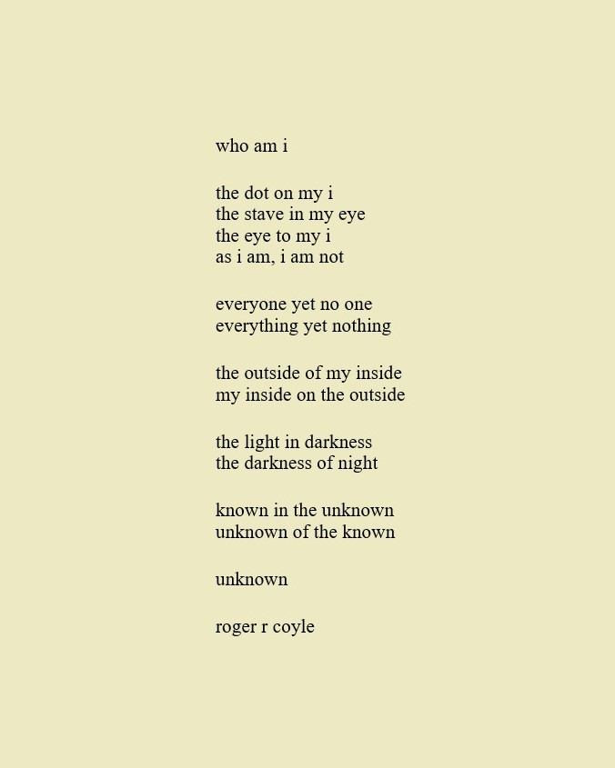 Some call me son, brother, godfather, cousin, uncle, writer, author, veteran, and friend. That may be true, but mostly I am me - a unique human being who has run the race of life through many different forests, down many roaring rivers and along some tangled paths. All in all it has been a good journey of growth and expansion of self. I am a lover of family, animals, food, laughs, poetry, books, compassionate people and chasing the light. My first journey into writing is Quiet Thoughts: Written Reflections. It is a book of poems and reflections - a small flicker of light into my life journey. I currently reside in Emmaus, PA and enjoy all that the Lehigh Valley has to offer. View all posts by rogerrcoyle