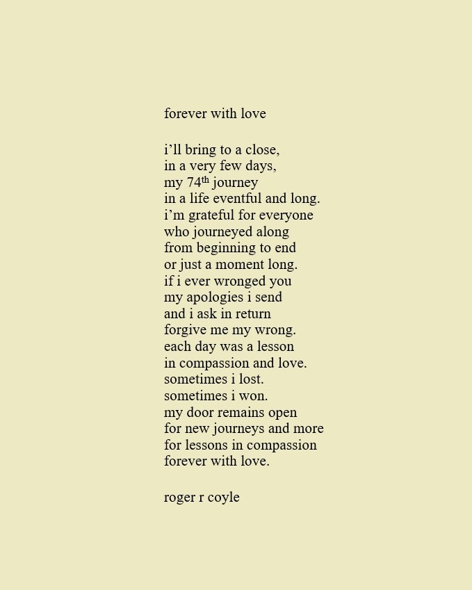 Some call me son, brother, godfather, cousin, uncle, writer, author, veteran, and friend. That may be true, but mostly I am me - a unique human being who has run the race of life through many different forests, down many roaring rivers and along some tangled paths. All in all it has been a good journey of growth and expansion of self. I am a lover of family, animals, food, laughs, poetry, books, compassionate people and chasing the light. My first journey into writing is Quiet Thoughts: Written Reflections. It is a book of poems and reflections - a small flicker of light into my life journey. I currently reside in Emmaus, PA and enjoy all that the Lehigh Valley has to offer. View all posts by rogerrcoyle