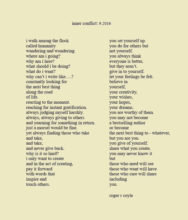Some call me son, brother, godfather, cousin, uncle, writer, author, veteran, and friend. That may be true, but mostly I am me - a unique human being who has run the race of life through many different forests, down many roaring rivers and along some tangled paths. All in all it has been a good journey of growth and expansion of self. I am a lover of family, animals, food, laughs, poetry, books, compassionate people and chasing the light. My first journey into writing is Quiet Thoughts: Written Reflections. It is a book of poems and reflections - a small flicker of light into my life journey. I currently reside in Emmaus, PA and enjoy all that the Lehigh Valley has to offer. View all posts by rogerrcoyle