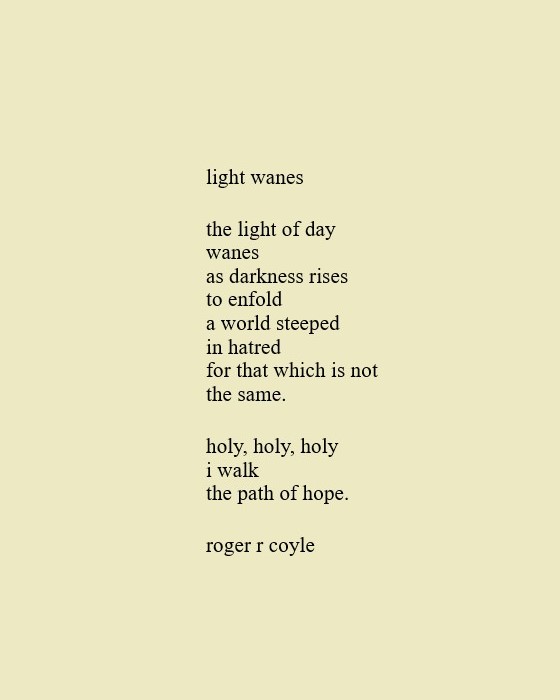 Some call me son, brother, godfather, cousin, uncle, writer, author, veteran, and friend. That may be true, but mostly I am me - a unique human being who has run the race of life through many different forests, down many roaring rivers and along some tangled paths. All in all it has been a good journey of growth and expansion of self. I am a lover of family, animals, food, laughs, poetry, books, compassionate people and chasing the light. My first journey into writing is Quiet Thoughts: Written Reflections. It is a book of poems and reflections - a small flicker of light into my life journey. I currently reside in Emmaus, PA and enjoy all that the Lehigh Valley has to offer. View all posts by rogerrcoyle