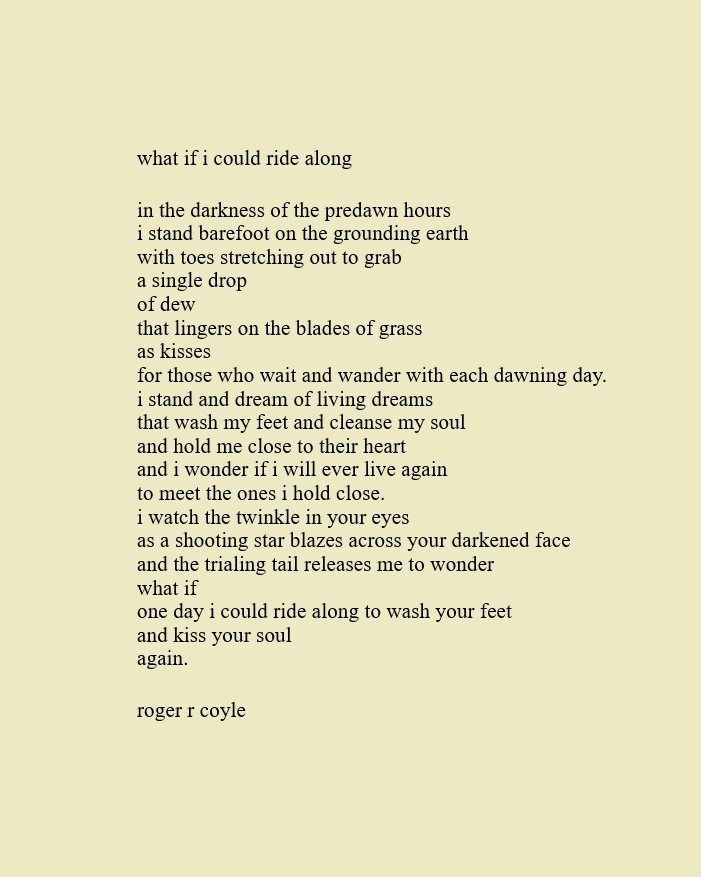 Some call me son, brother, godfather, cousin, uncle, writer, author, veteran, and friend. That may be true, but mostly I am me - a unique human being who has run the race of life through many different forests, down many roaring rivers and along some tangled paths. All in all it has been a good journey of growth and expansion of self. I am a lover of family, animals, food, laughs, poetry, books, compassionate people and chasing the light. My first journey into writing is Quiet Thoughts: Written Reflections. It is a book of poems and reflections - a small flicker of light into my life journey. I currently reside in Emmaus, PA and enjoy all that the Lehigh Valley has to offer. View all posts by rogerrcoyle