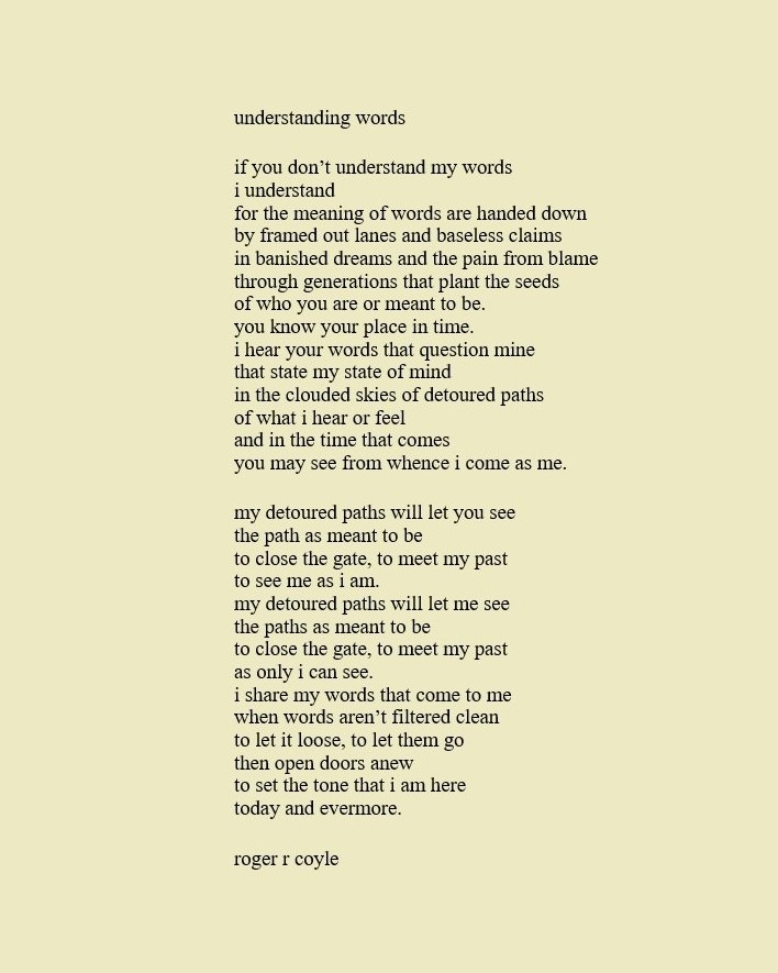 Some call me son, brother, godfather, cousin, uncle, writer, author, veteran, and friend. That may be true, but mostly I am me - a unique human being who has run the race of life through many different forests, down many roaring rivers and along some tangled paths. All in all it has been a good journey of growth and expansion of self. I am a lover of family, animals, food, laughs, poetry, books, compassionate people and chasing the light. My first journey into writing is Quiet Thoughts: Written Reflections. It is a book of poems and reflections - a small flicker of light into my life journey. I currently reside in Emmaus, PA and enjoy all that the Lehigh Valley has to offer. View all posts by rogerrcoyle
