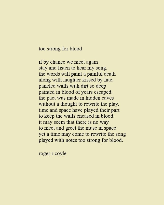 Some call me son, brother, godfather, cousin, uncle, writer, author, veteran, and friend. That may be true, but mostly I am me - a unique human being who has run the race of life through many different forests, down many roaring rivers and along some tangled paths. All in all it has been a good journey of growth and expansion of self. I am a lover of family, animals, food, laughs, poetry, books, compassionate people and chasing the light. My first journey into writing is Quiet Thoughts: Written Reflections. It is a book of poems and reflections - a small flicker of light into my life journey. I currently reside in Emmaus, PA and enjoy all that the Lehigh Valley has to offer. View all posts by rogerrcoyle