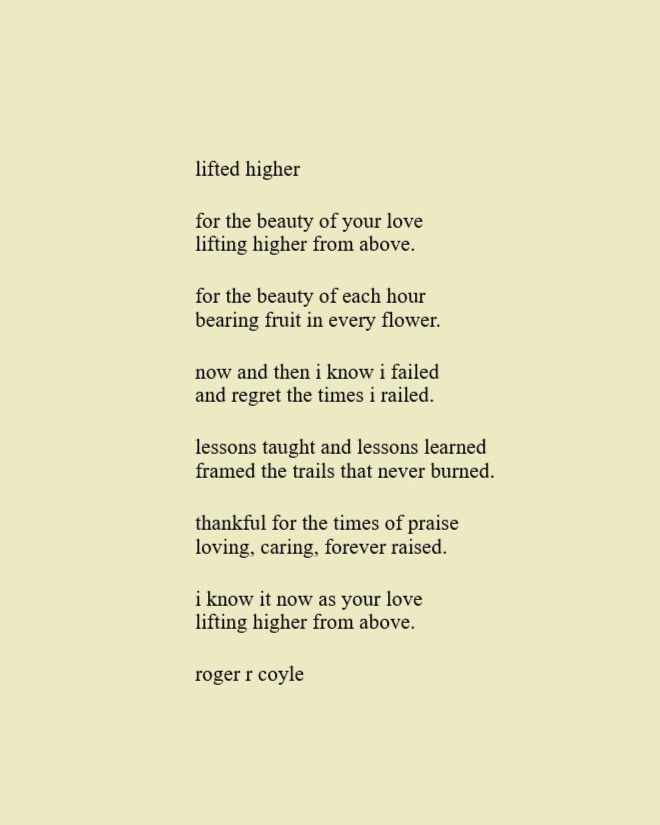 Some call me son, brother, godfather, cousin, uncle, writer, author, veteran, and friend. That may be true, but mostly I am me - a unique human being who has run the race of life through many different forests, down many roaring rivers and along some tangled paths. All in all it has been a good journey of growth and expansion of self. I am a lover of family, animals, food, laughs, poetry, books, compassionate people and chasing the light. My first journey into writing is Quiet Thoughts: Written Reflections. It is a book of poems and reflections - a small flicker of light into my life journey. I currently reside in Emmaus, PA and enjoy all that the Lehigh Valley has to offer. View all posts by rogerrcoyle