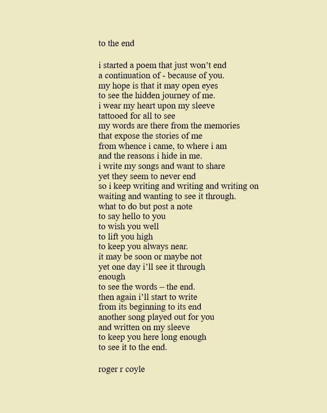 Some call me son, brother, godfather, cousin, uncle, writer, author, veteran, and friend. That may be true, but mostly I am me - a unique human being who has run the race of life through many different forests, down many roaring rivers and along some tangled paths. All in all it has been a good journey of growth and expansion of self. I am a lover of family, animals, food, laughs, poetry, books, compassionate people and chasing the light. My first journey into writing is Quiet Thoughts: Written Reflections. It is a book of poems and reflections - a small flicker of light into my life journey. I currently reside in Emmaus, PA and enjoy all that the Lehigh Valley has to offer. View all posts by rogerrcoyle