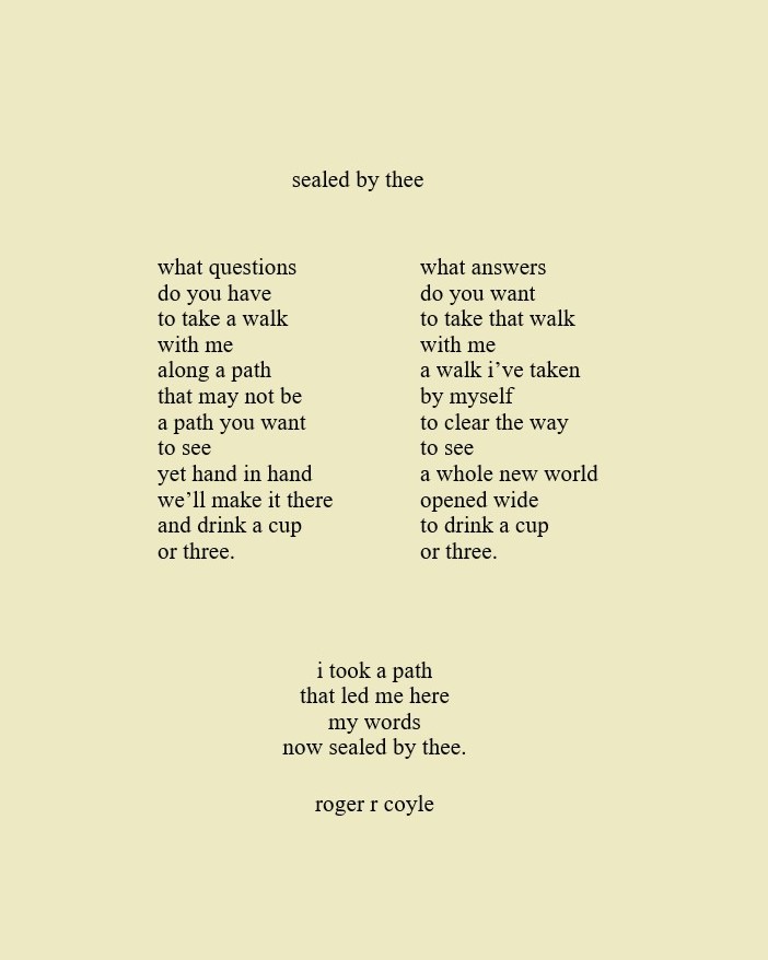 Some call me son, brother, godfather, cousin, uncle, writer, author, veteran, and friend. That may be true, but mostly I am me - a unique human being who has run the race of life through many different forests, down many roaring rivers and along some tangled paths. All in all it has been a good journey of growth and expansion of self. I am a lover of family, animals, food, laughs, poetry, books, compassionate people and chasing the light. My first journey into writing is Quiet Thoughts: Written Reflections. It is a book of poems and reflections - a small flicker of light into my life journey. I currently reside in Emmaus, PA and enjoy all that the Lehigh Valley has to offer. View all posts by rogerrcoyle