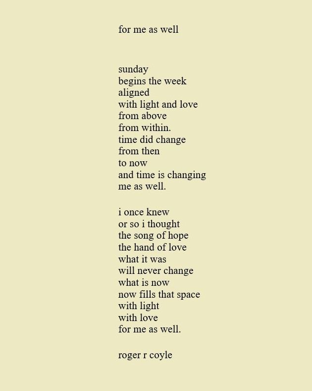 Some call me son, brother, godfather, cousin, uncle, writer, author, veteran, and friend. That may be true, but mostly I am me - a unique human being who has run the race of life through many different forests, down many roaring rivers and along some tangled paths. All in all it has been a good journey of growth and expansion of self. I am a lover of family, animals, food, laughs, poetry, books, compassionate people and chasing the light. My first journey into writing is Quiet Thoughts: Written Reflections. It is a book of poems and reflections - a small flicker of light into my life journey. I currently reside in Emmaus, PA and enjoy all that the Lehigh Valley has to offer. View all posts by rogerrcoyle
