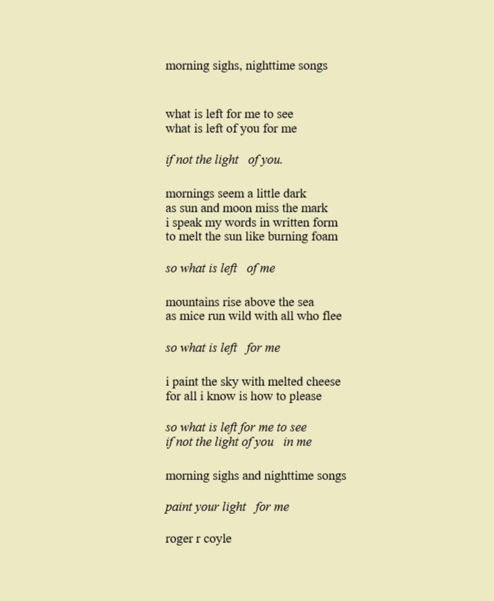 Some call me son, brother, godfather, cousin, uncle, writer, author, veteran, and friend. That may be true, but mostly I am me - a unique human being who has run the race of life through many different forests, down many roaring rivers and along some tangled paths. All in all it has been a good journey of growth and expansion of self. I am a lover of family, animals, food, laughs, poetry, books, compassionate people and chasing the light. My first journey into writing is Quiet Thoughts: Written Reflections. It is a book of poems and reflections - a small flicker of light into my life journey. I currently reside in Emmaus, PA and enjoy all that the Lehigh Valley has to offer. View all posts by rogerrcoyle
