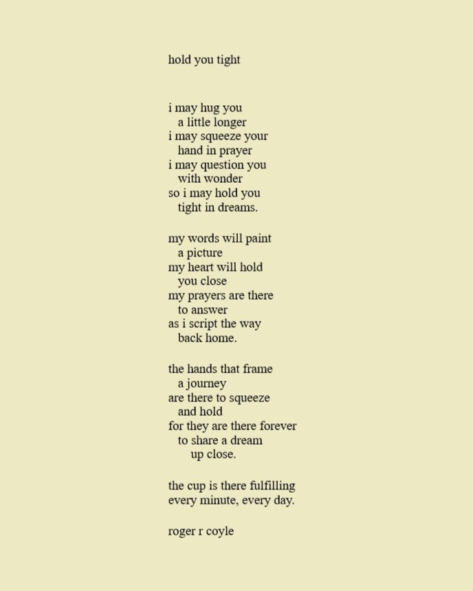 Some call me son, brother, godfather, cousin, uncle, writer, author, veteran, and friend. That may be true, but mostly I am me - a unique human being who has run the race of life through many different forests, down many roaring rivers and along some tangled paths. All in all it has been a good journey of growth and expansion of self. I am a lover of family, animals, food, laughs, poetry, books, compassionate people and chasing the light. My first journey into writing is Quiet Thoughts: Written Reflections. It is a book of poems and reflections - a small flicker of light into my life journey. I currently reside in Emmaus, PA and enjoy all that the Lehigh Valley has to offer. View all posts by rogerrcoyle