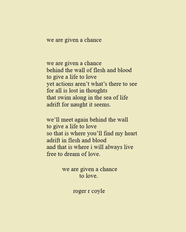 Some call me son, brother, godfather, cousin, uncle, writer, author, veteran, and friend. That may be true, but mostly I am me - a unique human being who has run the race of life through many different forests, down many roaring rivers and along some tangled paths. All in all it has been a good journey of growth and expansion of self. I am a lover of family, animals, food, laughs, poetry, books, compassionate people and chasing the light. My first journey into writing is Quiet Thoughts: Written Reflections. It is a book of poems and reflections - a small flicker of light into my life journey. I currently reside in Emmaus, PA and enjoy all that the Lehigh Valley has to offer. View all posts by rogerrcoyle