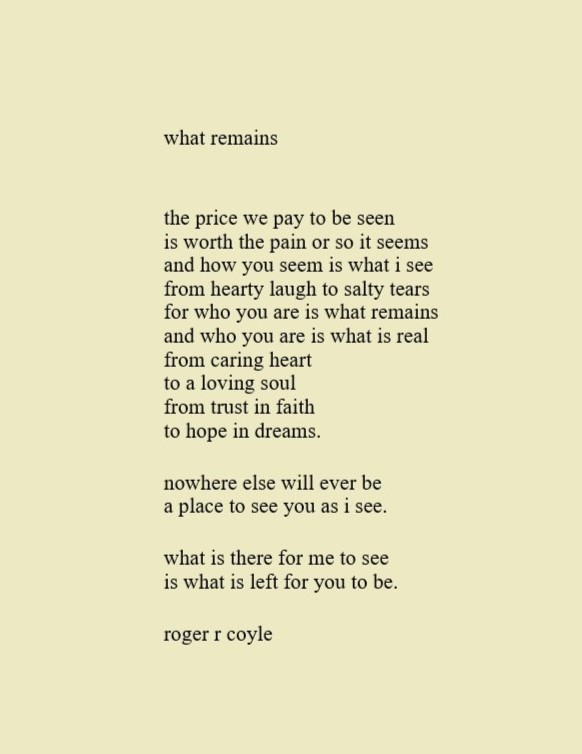 Some call me son, brother, godfather, cousin, uncle, writer, author, veteran, and friend. That may be true, but mostly I am me - a unique human being who has run the race of life through many different forests, down many roaring rivers and along some tangled paths. All in all it has been a good journey of growth and expansion of self. I am a lover of family, animals, food, laughs, poetry, books, compassionate people and chasing the light. My first journey into writing is Quiet Thoughts: Written Reflections. It is a book of poems and reflections - a small flicker of light into my life journey. I currently reside in Emmaus, PA and enjoy all that the Lehigh Valley has to offer. View all posts by rogerrcoyle