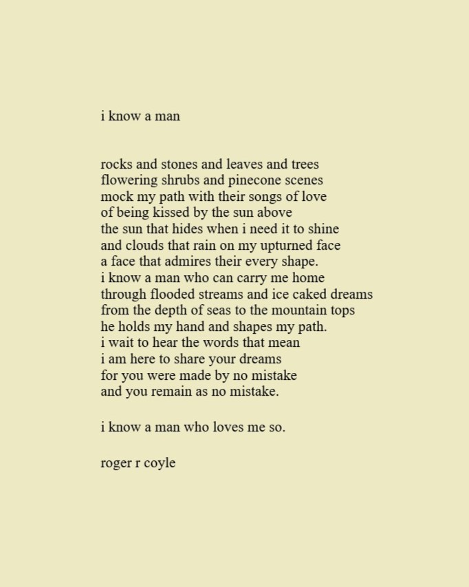Some call me son, brother, godfather, cousin, uncle, writer, author, veteran, and friend. That may be true, but mostly I am me - a unique human being who has run the race of life through many different forests, down many roaring rivers and along some tangled paths. All in all it has been a good journey of growth and expansion of self. I am a lover of family, animals, food, laughs, poetry, books, compassionate people and chasing the light. My first journey into writing is Quiet Thoughts: Written Reflections. It is a book of poems and reflections - a small flicker of light into my life journey. I currently reside in Emmaus, PA and enjoy all that the Lehigh Valley has to offer. View all posts by rogerrcoyle