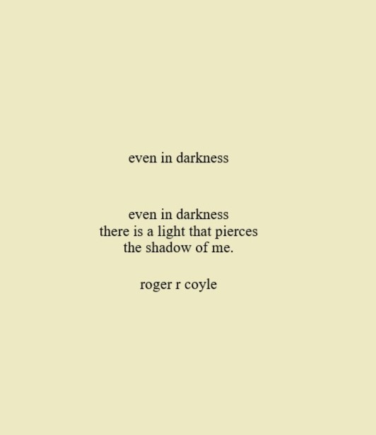 Some call me son, brother, godfather, cousin, uncle, writer, author, veteran, and friend. That may be true, but mostly I am me - a unique human being who has run the race of life through many different forests, down many roaring rivers and along some tangled paths. All in all it has been a good journey of growth and expansion of self. I am a lover of family, animals, food, laughs, poetry, books, compassionate people and chasing the light. My first journey into writing is Quiet Thoughts: Written Reflections. It is a book of poems and reflections - a small flicker of light into my life journey. I currently reside in Emmaus, PA and enjoy all that the Lehigh Valley has to offer. View all posts by rogerrcoyle