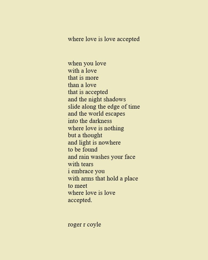 Some call me son, brother, godfather, cousin, uncle, writer, author, veteran, and friend. That may be true, but mostly I am me - a unique human being who has run the race of life through many different forests, down many roaring rivers and along some tangled paths. All in all it has been a good journey of growth and expansion of self. I am a lover of family, animals, food, laughs, poetry, books, compassionate people and chasing the light. My first journey into writing is Quiet Thoughts: Written Reflections. It is a book of poems and reflections - a small flicker of light into my life journey. I currently reside in Emmaus, PA and enjoy all that the Lehigh Valley has to offer. View all posts by rogerrcoyle