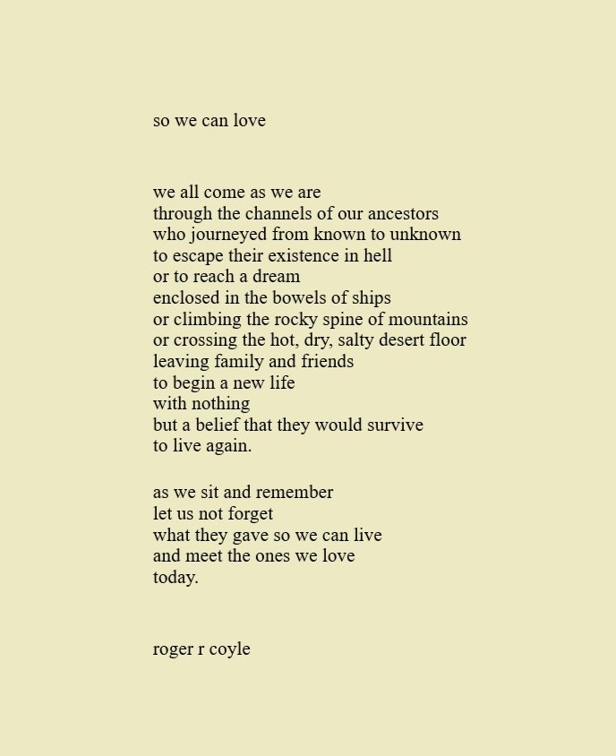Some call me son, brother, godfather, cousin, uncle, writer, author, veteran, and friend. That may be true, but mostly I am me - a unique human being who has run the race of life through many different forests, down many roaring rivers and along some tangled paths. All in all it has been a good journey of growth and expansion of self. I am a lover of family, animals, food, laughs, poetry, books, compassionate people and chasing the light. My first journey into writing is Quiet Thoughts: Written Reflections. It is a book of poems and reflections - a small flicker of light into my life journey. I currently reside in Emmaus, PA and enjoy all that the Lehigh Valley has to offer. View all posts by rogerrcoyle