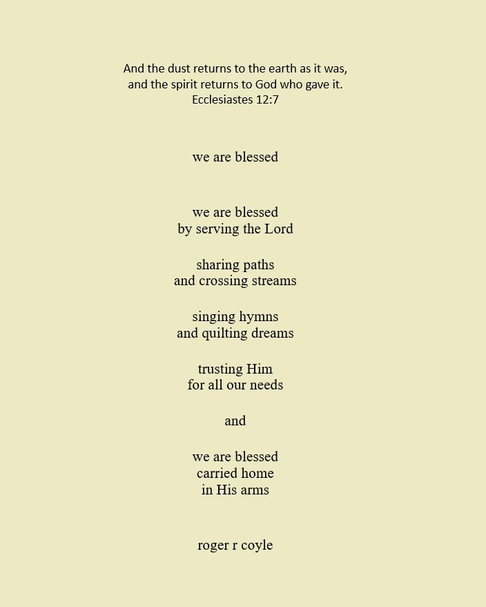 Some call me son, brother, godfather, cousin, uncle, writer, author, veteran, and friend. That may be true, but mostly I am me - a unique human being who has run the race of life through many different forests, down many roaring rivers and along some tangled paths. All in all it has been a good journey of growth and expansion of self. I am a lover of family, animals, food, laughs, poetry, books, compassionate people and chasing the light. My first journey into writing is Quiet Thoughts: Written Reflections. It is a book of poems and reflections - a small flicker of light into my life journey. I currently reside in Emmaus, PA and enjoy all that the Lehigh Valley has to offer. View all posts by rogerrcoyle