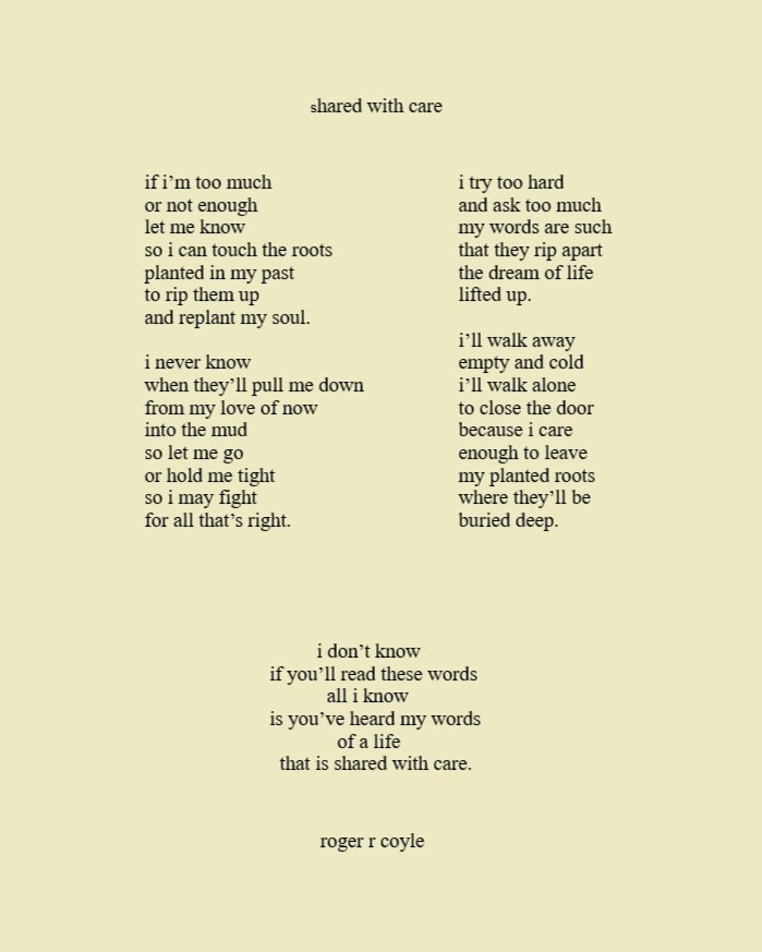 Some call me son, brother, godfather, cousin, uncle, writer, author, veteran, and friend. That may be true, but mostly I am me - a unique human being who has run the race of life through many different forests, down many roaring rivers and along some tangled paths. All in all it has been a good journey of growth and expansion of self. I am a lover of family, animals, food, laughs, poetry, books, compassionate people and chasing the light. My first journey into writing is Quiet Thoughts: Written Reflections. It is a book of poems and reflections - a small flicker of light into my life journey. I currently reside in Emmaus, PA and enjoy all that the Lehigh Valley has to offer. View all posts by rogerrcoyle