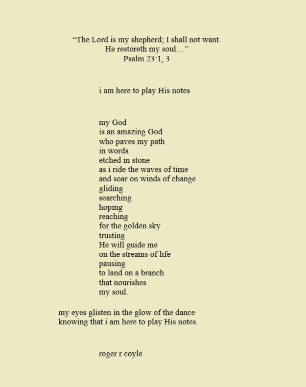 Some call me son, brother, godfather, cousin, uncle, writer, author, veteran, and friend. That may be true, but mostly I am me - a unique human being who has run the race of life through many different forests, down many roaring rivers and along some tangled paths. All in all it has been a good journey of growth and expansion of self. I am a lover of family, animals, food, laughs, poetry, books, compassionate people and chasing the light. My first journey into writing is Quiet Thoughts: Written Reflections. It is a book of poems and reflections - a small flicker of light into my life journey. I currently reside in Emmaus, PA and enjoy all that the Lehigh Valley has to offer. View all posts by rogerrcoyle