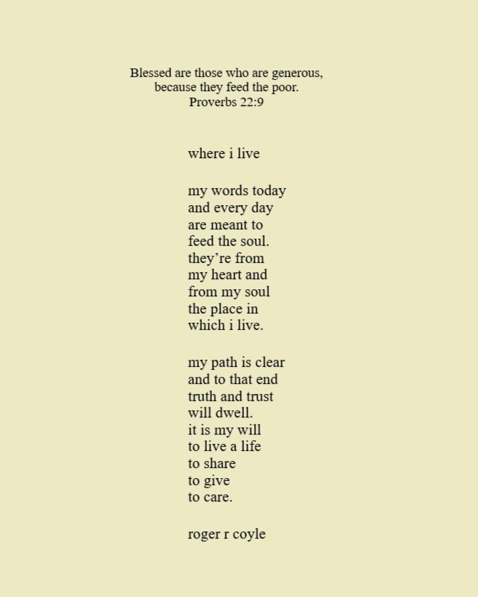 Some call me son, brother, godfather, cousin, uncle, writer, author, veteran, and friend. That may be true, but mostly I am me - a unique human being who has run the race of life through many different forests, down many roaring rivers and along some tangled paths. All in all it has been a good journey of growth and expansion of self. I am a lover of family, animals, food, laughs, poetry, books, compassionate people and chasing the light. My first journey into writing is Quiet Thoughts: Written Reflections. It is a book of poems and reflections - a small flicker of light into my life journey. I currently reside in Emmaus, PA and enjoy all that the Lehigh Valley has to offer. View all posts by rogerrcoyle