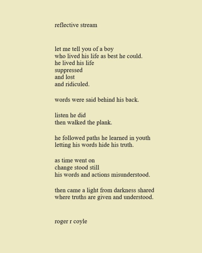 Some call me son, brother, godfather, cousin, uncle, writer, author, veteran, and friend. That may be true, but mostly I am me - a unique human being who has run the race of life through many different forests, down many roaring rivers and along some tangled paths. All in all it has been a good journey of growth and expansion of self. I am a lover of family, animals, food, laughs, poetry, books, compassionate people and chasing the light. My first journey into writing is Quiet Thoughts: Written Reflections. It is a book of poems and reflections - a small flicker of light into my life journey. I currently reside in Emmaus, PA and enjoy all that the Lehigh Valley has to offer. View all posts by rogerrcoyle