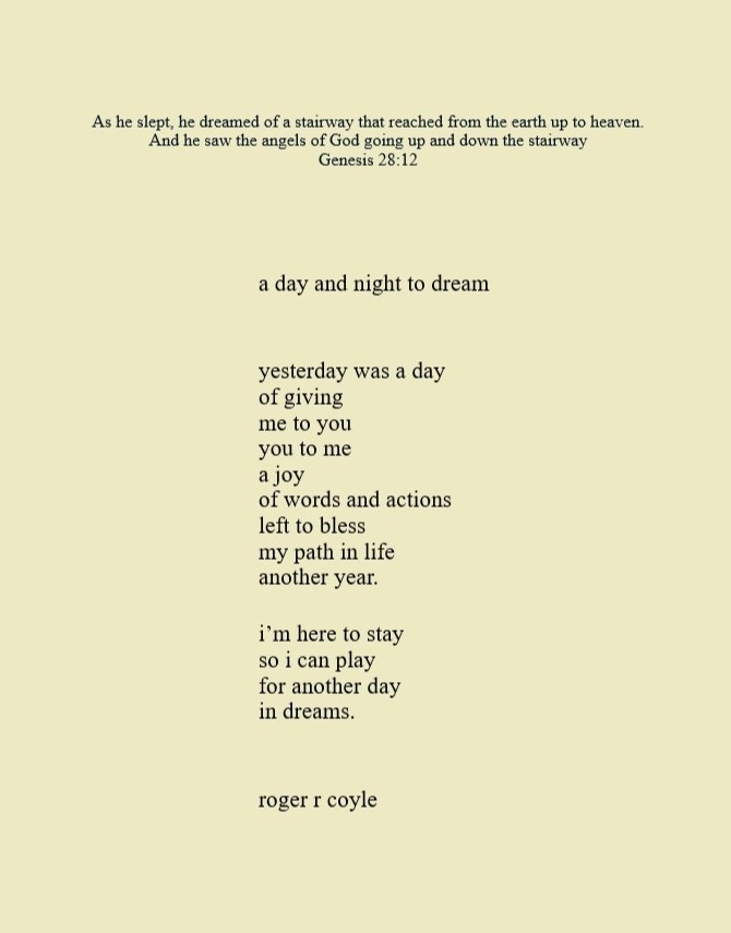 Some call me son, brother, godfather, cousin, uncle, writer, author, veteran, and friend. That may be true, but mostly I am me - a unique human being who has run the race of life through many different forests, down many roaring rivers and along some tangled paths. All in all it has been a good journey of growth and expansion of self. I am a lover of family, animals, food, laughs, poetry, books, compassionate people and chasing the light. My first journey into writing is Quiet Thoughts: Written Reflections. It is a book of poems and reflections - a small flicker of light into my life journey. I currently reside in Emmaus, PA and enjoy all that the Lehigh Valley has to offer. View all posts by rogerrcoyle