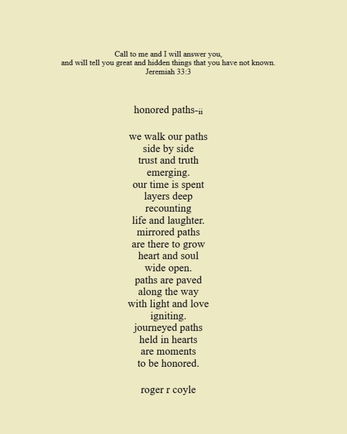 Some call me son, brother, godfather, cousin, uncle, writer, author, veteran, and friend. That may be true, but mostly I am me - a unique human being who has run the race of life through many different forests, down many roaring rivers and along some tangled paths. All in all it has been a good journey of growth and expansion of self. I am a lover of family, animals, food, laughs, poetry, books, compassionate people and chasing the light. My first journey into writing is Quiet Thoughts: Written Reflections. It is a book of poems and reflections - a small flicker of light into my life journey. I currently reside in Emmaus, PA and enjoy all that the Lehigh Valley has to offer. View all posts by rogerrcoyle