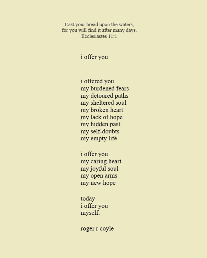 Some call me son, brother, godfather, cousin, uncle, writer, author, veteran, and friend. That may be true, but mostly I am me - a unique human being who has run the race of life through many different forests, down many roaring rivers and along some tangled paths. All in all it has been a good journey of growth and expansion of self. I am a lover of family, animals, food, laughs, poetry, books, compassionate people and chasing the light. My first journey into writing is Quiet Thoughts: Written Reflections. It is a book of poems and reflections - a small flicker of light into my life journey. I currently reside in Emmaus, PA and enjoy all that the Lehigh Valley has to offer. View all posts by rogerrcoyle