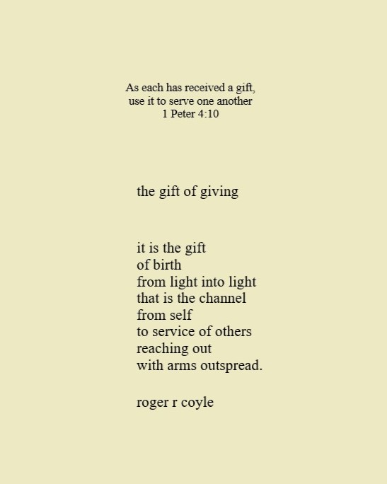 Some call me son, brother, godfather, cousin, uncle, writer, author, veteran, and friend. That may be true, but mostly I am me - a unique human being who has run the race of life through many different forests, down many roaring rivers and along some tangled paths. All in all it has been a good journey of growth and expansion of self. I am a lover of family, animals, food, laughs, poetry, books, compassionate people and chasing the light. My first journey into writing is Quiet Thoughts: Written Reflections. It is a book of poems and reflections - a small flicker of light into my life journey. I currently reside in Emmaus, PA and enjoy all that the Lehigh Valley has to offer. View all posts by rogerrcoyle