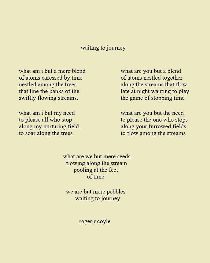 Some call me son, brother, godfather, cousin, uncle, writer, author, veteran, and friend. That may be true, but mostly I am me - a unique human being who has run the race of life through many different forests, down many roaring rivers and along some tangled paths. All in all it has been a good journey of growth and expansion of self. I am a lover of family, animals, food, laughs, poetry, books, compassionate people and chasing the light. My first journey into writing is Quiet Thoughts: Written Reflections. It is a book of poems and reflections - a small flicker of light into my life journey. I currently reside in Emmaus, PA and enjoy all that the Lehigh Valley has to offer. View all posts by rogerrcoyle
