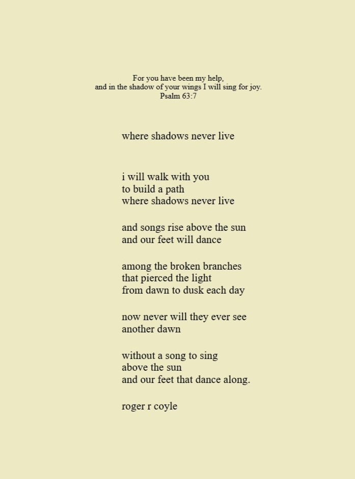 Some call me son, brother, godfather, cousin, uncle, writer, author, veteran, and friend. That may be true, but mostly I am me - a unique human being who has run the race of life through many different forests, down many roaring rivers and along some tangled paths. All in all it has been a good journey of growth and expansion of self. I am a lover of family, animals, food, laughs, poetry, books, compassionate people and chasing the light. My first journey into writing is Quiet Thoughts: Written Reflections. It is a book of poems and reflections - a small flicker of light into my life journey. I currently reside in Emmaus, PA and enjoy all that the Lehigh Valley has to offer. View all posts by rogerrcoyle
