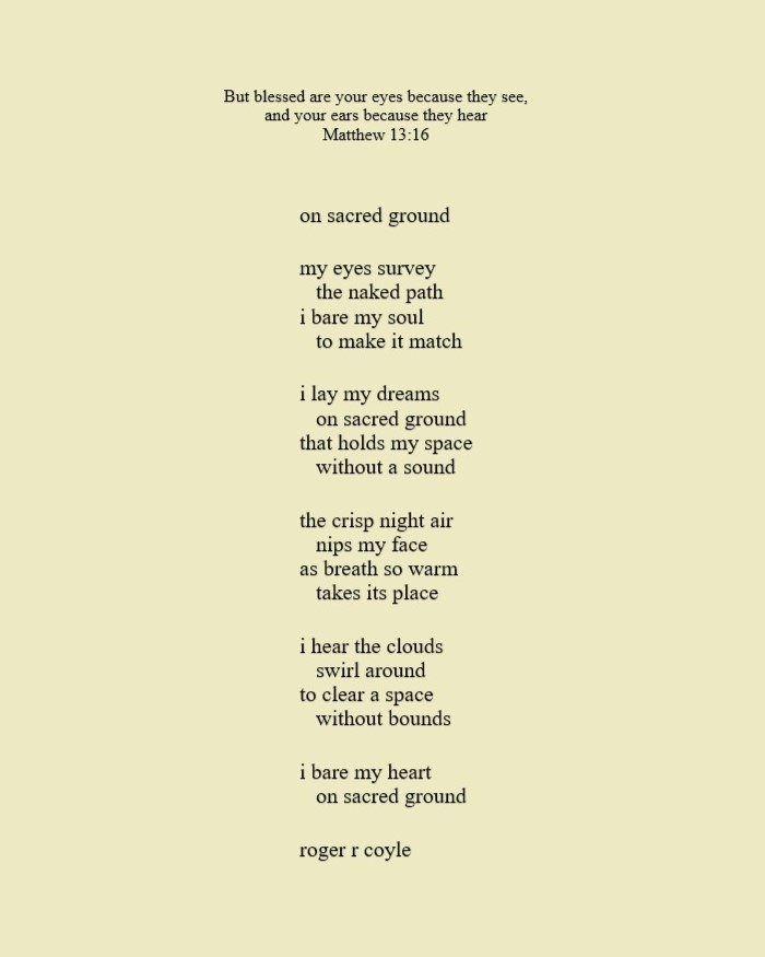 Some call me son, brother, godfather, cousin, uncle, writer, author, veteran, and friend. That may be true, but mostly I am me - a unique human being who has run the race of life through many different forests, down many roaring rivers and along some tangled paths. All in all it has been a good journey of growth and expansion of self. I am a lover of family, animals, food, laughs, poetry, books, compassionate people and chasing the light. My first journey into writing is Quiet Thoughts: Written Reflections. It is a book of poems and reflections - a small flicker of light into my life journey. I currently reside in Emmaus, PA and enjoy all that the Lehigh Valley has to offer. View all posts by rogerrcoyle