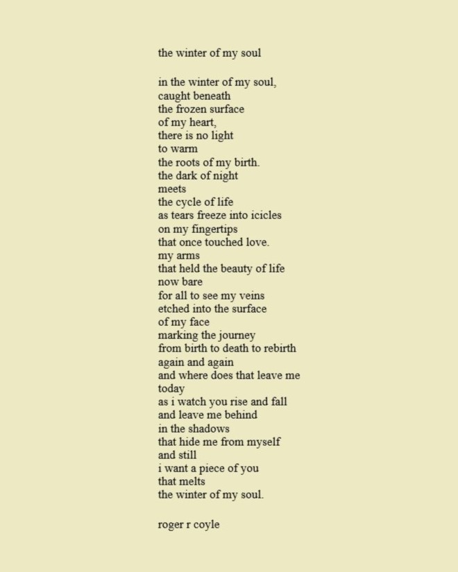 Some call me son, brother, godfather, cousin, uncle, writer, author, veteran, and friend. That may be true, but mostly I am me - a unique human being who has run the race of life through many different forests, down many roaring rivers and along some tangled paths. All in all it has been a good journey of growth and expansion of self. I am a lover of family, animals, food, laughs, poetry, books, compassionate people and chasing the light. My first journey into writing is Quiet Thoughts: Written Reflections. It is a book of poems and reflections - a small flicker of light into my life journey. I currently reside in Emmaus, PA and enjoy all that the Lehigh Valley has to offer. View all posts by rogerrcoyle