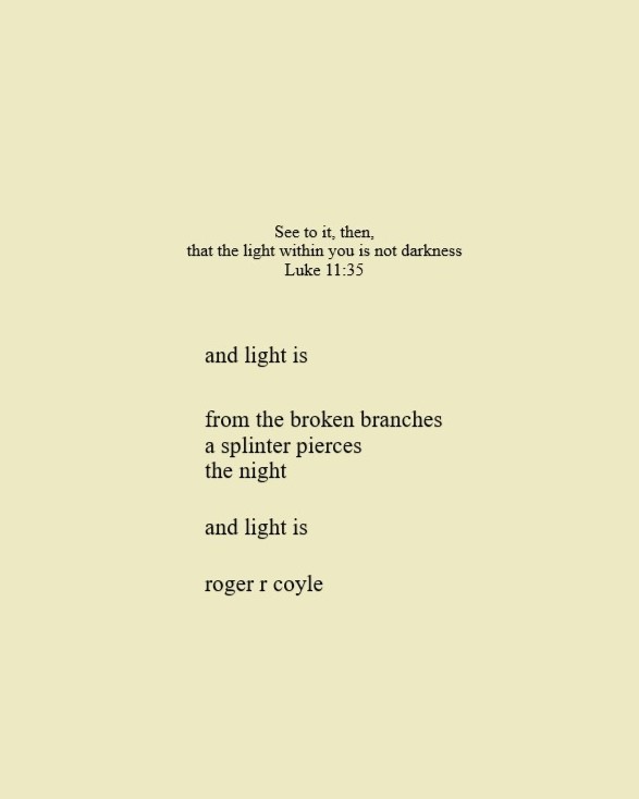 Some call me son, brother, godfather, cousin, uncle, writer, author, veteran, and friend. That may be true, but mostly I am me - a unique human being who has run the race of life through many different forests, down many roaring rivers and along some tangled paths. All in all it has been a good journey of growth and expansion of self. I am a lover of family, animals, food, laughs, poetry, books, compassionate people and chasing the light. My first journey into writing is Quiet Thoughts: Written Reflections. It is a book of poems and reflections - a small flicker of light into my life journey. I currently reside in Emmaus, PA and enjoy all that the Lehigh Valley has to offer. View all posts by rogerrcoyle