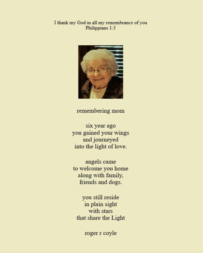 Some call me son, brother, godfather, cousin, uncle, writer, author, veteran, and friend. That may be true, but mostly I am me - a unique human being who has run the race of life through many different forests, down many roaring rivers and along some tangled paths. All in all it has been a good journey of growth and expansion of self. I am a lover of family, animals, food, laughs, poetry, books, compassionate people and chasing the light. My first journey into writing is Quiet Thoughts: Written Reflections. It is a book of poems and reflections - a small flicker of light into my life journey. I currently reside in Emmaus, PA and enjoy all that the Lehigh Valley has to offer. View all posts by rogerrcoyle