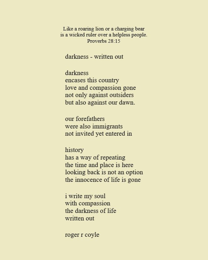 Some call me son, brother, godfather, cousin, uncle, writer, author, veteran, and friend. That may be true, but mostly I am me - a unique human being who has run the race of life through many different forests, down many roaring rivers and along some tangled paths. All in all it has been a good journey of growth and expansion of self. I am a lover of family, animals, food, laughs, poetry, books, compassionate people and chasing the light. My first journey into writing is Quiet Thoughts: Written Reflections. It is a book of poems and reflections - a small flicker of light into my life journey. I currently reside in Emmaus, PA and enjoy all that the Lehigh Valley has to offer. View all posts by rogerrcoyle