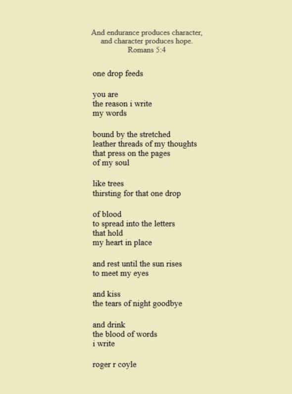Some call me son, brother, godfather, cousin, uncle, writer, author, veteran, and friend. That may be true, but mostly I am me - a unique human being who has run the race of life through many different forests, down many roaring rivers and along some tangled paths. All in all it has been a good journey of growth and expansion of self. I am a lover of family, animals, food, laughs, poetry, books, compassionate people and chasing the light. My first journey into writing is Quiet Thoughts: Written Reflections. It is a book of poems and reflections - a small flicker of light into my life journey. I currently reside in Emmaus, PA and enjoy all that the Lehigh Valley has to offer. View all posts by rogerrcoyle